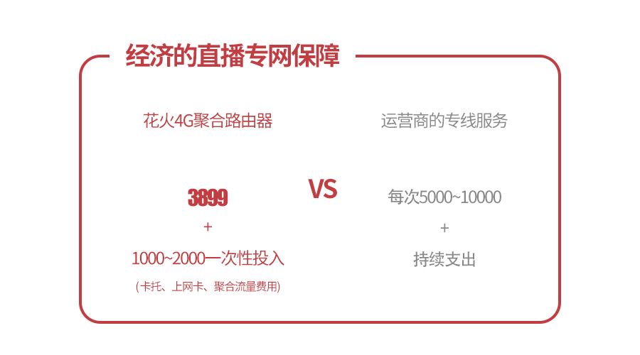 原先的解决方案只有运营商的专线服务可选,一次使用花费巨大!(数千上万元不等),而花火聚合主机加另配上网卡、卡托和聚合流量费用总投入五六千元,即可在以后的户外直播中不必为专网的不菲花费买单!